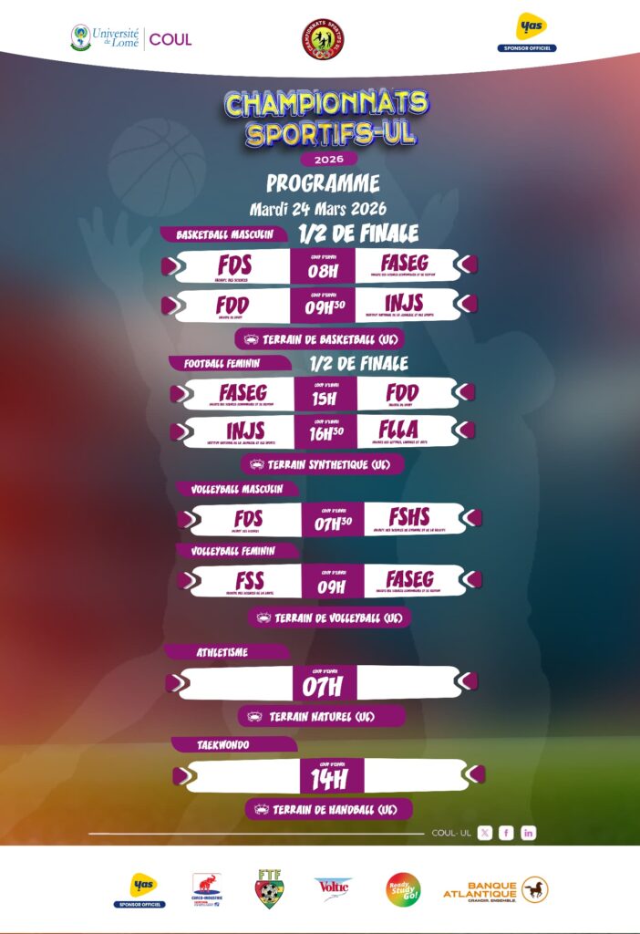 Le tempo s’accélère sur le campus de Université de Lomé. Ce mardi 24 mars 2026, les Championnats Sportifs UL franchissent un cap décisif avec des demi-finales à haute intensité. Plus de place pour l’approximation, chaque action pèse, chaque détail compte.